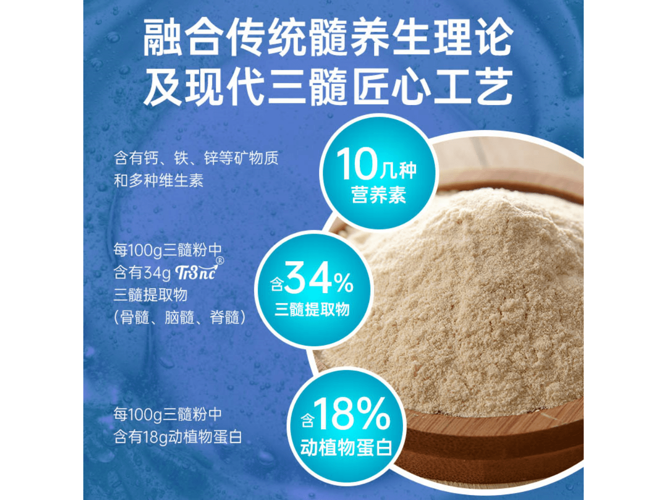 每 100g 含三髓(牛脑髓、骨髓、脊髓)提取物 34g